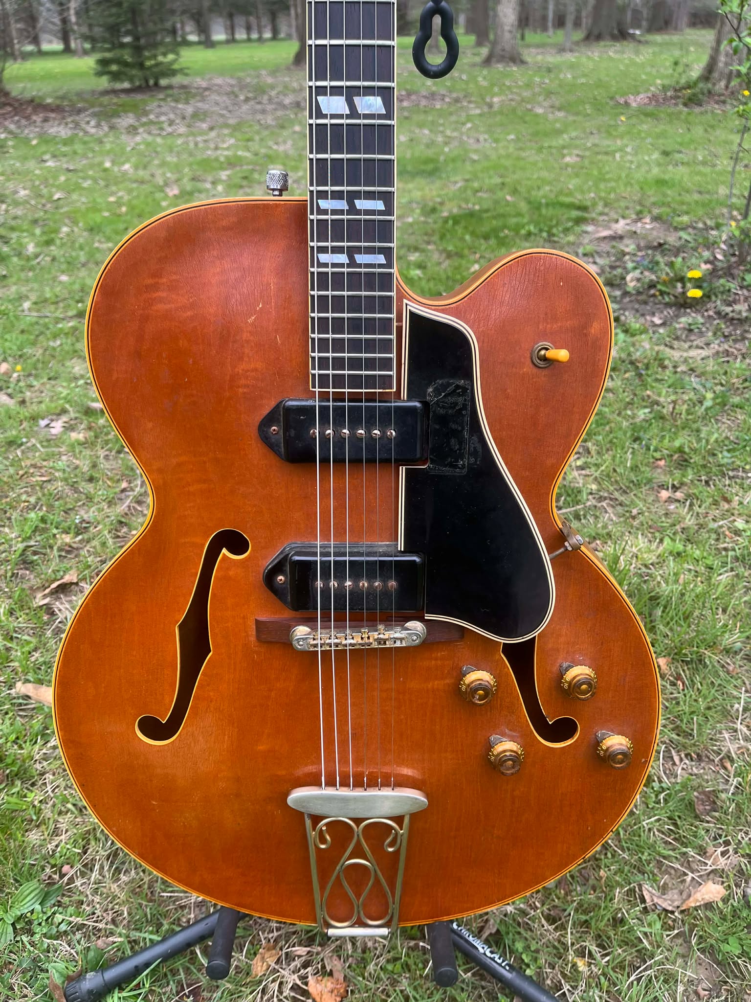 Detailed Evaluation: We verify 1956 dating through serial/FON/pot codes, authenticate P-90 pickups (construction details, resistance measurement, date codes), assess finish originality (natural or sunburst, aging patterns, refinishing signs), inspect bound f-holes and binding integrity, verify gold hardware originality, check block inlay condition, assess structural integrity (cracks, seam separation, binding issues), and evaluate complete originality.